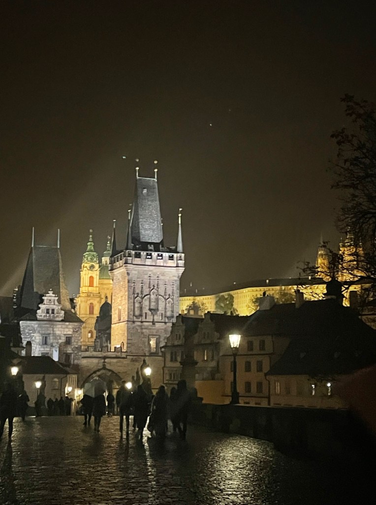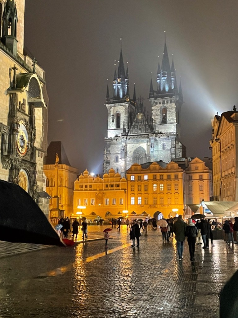 As we navigated rainy streets and cobblestone sidewalks, we were able to see Prague’s beauty and history at sunset and through the evening hours. We crossed the Charles Bridge over the Vltava River, which connects the Prague Castle and Old Town Prague and until 1841, it was the only means of crossing the river until 1841 and allowed an important trade route between Eastern and Western Europe.