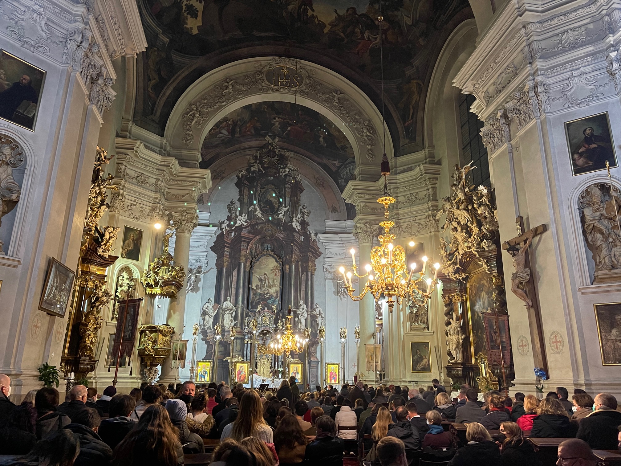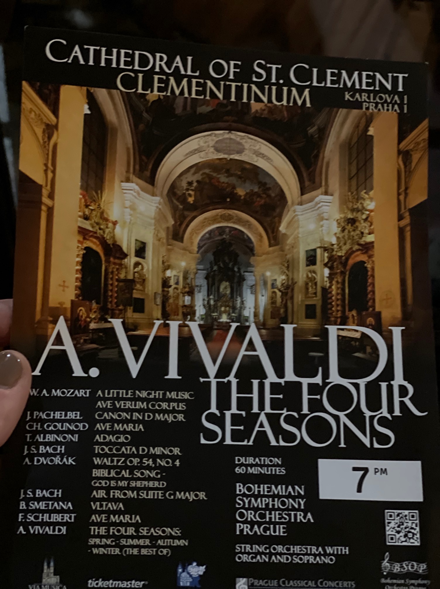 Following a delicious dinner, a highlight of our trip was the concert performance of Vivaldi’s Four Seasons held at the St. Kliment Cathedral. St. Clement’s Cathedral represents one of the most important examples of Baroque architecture in Prague. Today it is owned by the Greek Orthodox Church. St. Clement’s is known for its excellent acoustics, making the church a fine venue for classical music concerts. These run throughout the year, and feature the original 18th century Baroque organ.