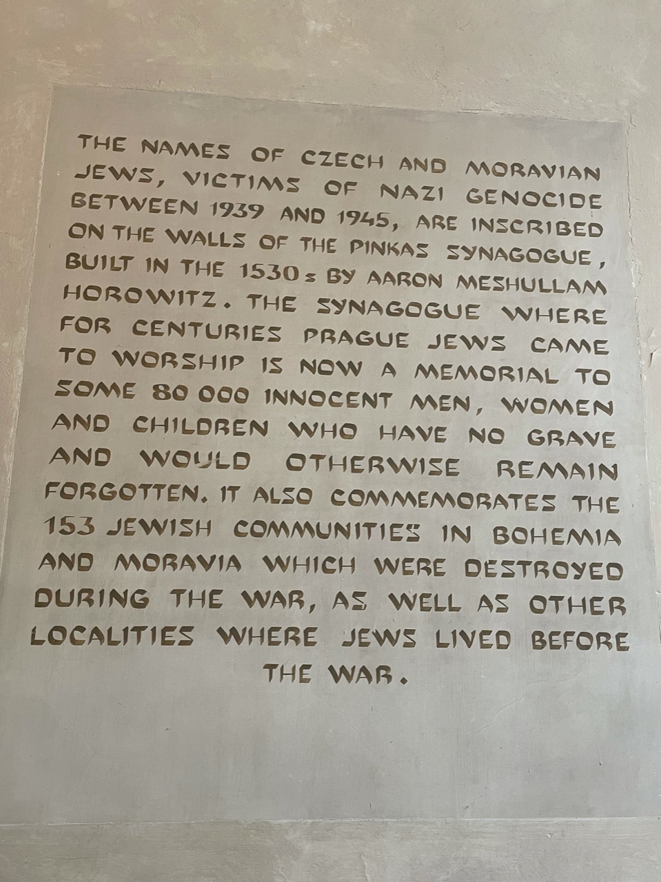 Our first stop was the Pinkas Synagogue which in 1955-60 was turned into a memorial to the nearly 80,000 Jewish victims of the Shoah from the Czech lands. It was one of the earliest memorials of its kind in Europe and features the names, dates of birth and dates of death or transport of all known victims.